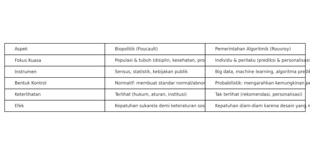 Pertanyaannya: apa arti kuasa di era seperti ini? Bagaimana kita dapat memahaminya — dan menanggapinya — secara kritis? Dua pemikir besar memberi kita alat untuk menjawabnya: Michel Foucault, yang mengajarkan kita membaca “biopolitik” kuasa modern, dan Antoinette Rouvroy, yang memperkenalkan gagasan algorithmic governmentality — cara algoritma memerintah tanpa harus terlihat memerintah.
